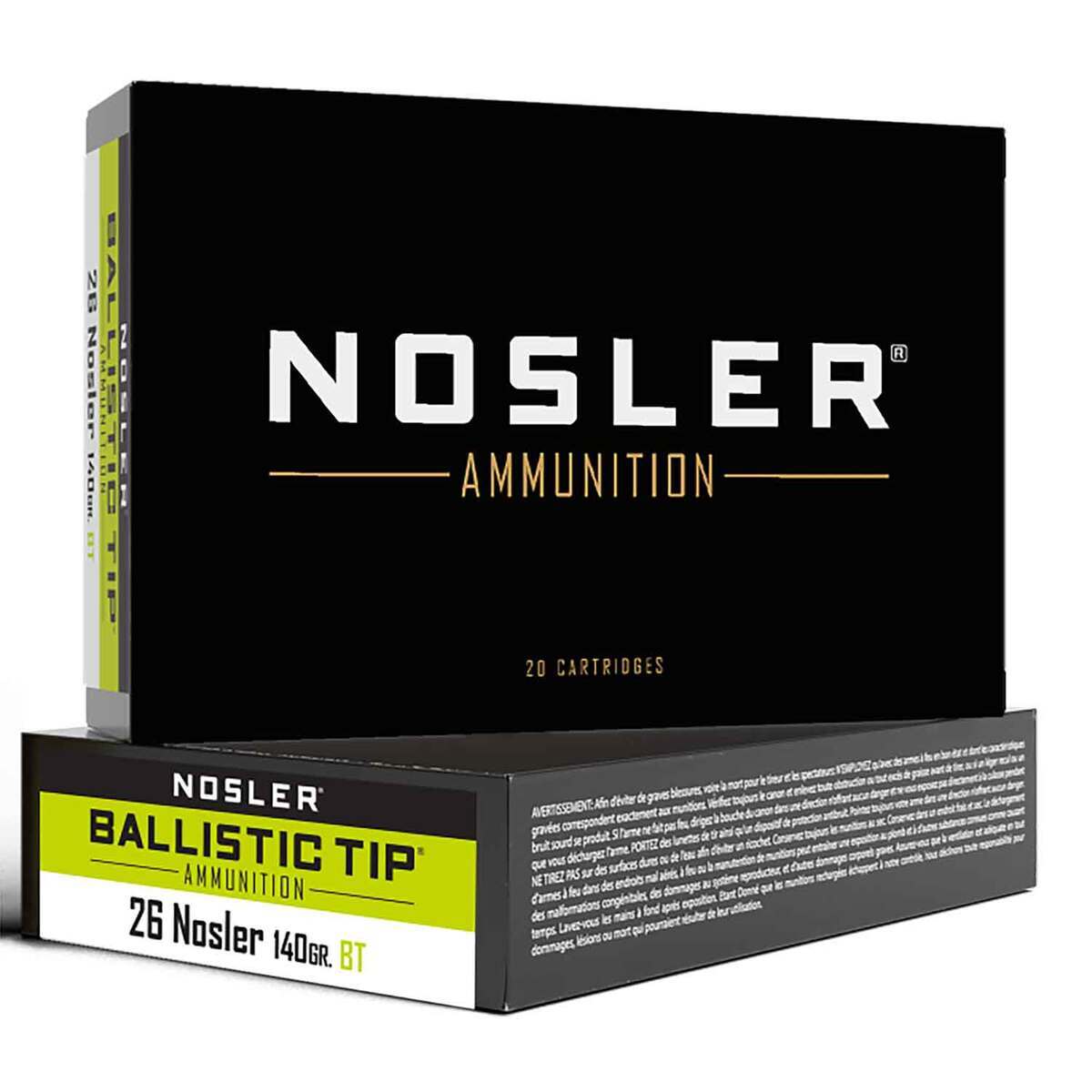 Nosler 26 Nosler 140gr FMJ Ballistic Tip Hunting Ammo – 20 Rounds – Loaded with a 160gr Spitzer Ballistic Tip Hunting Bullet and Nosler Premium Brass – Nosler Ballistic Tip ammunition is loaded with the accurate and reliable Nosler Ballistic Tip hunting bullet. The Ballistic Tip hunting bullet’s heavily jacketed base acts as a platform for large-diameter mushrooms while the boat-tail design enhances long-range accuracy for devastating performance at all practical velocities. Delivering the accuracy, consistency and down range punch required for clean kills in all situations, Nosler’s Ballistic Tip ammunition is optimized for maximum effectiveness on deer, antelope and hogs.