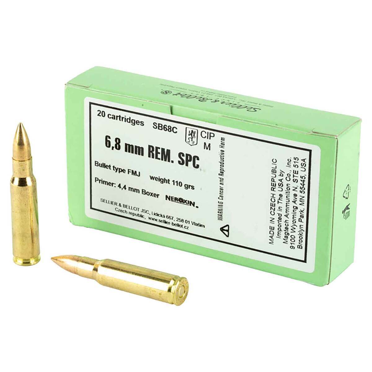 Sellier & Bellot 6.8mm Remington SPC 110gr FMJ Rifle Ammo – 20 Rounds – This is excellent ammo for practice, recreational shooters, serious competitive handgun shooting sports, bullseye competitors shooting, action pistol shooting matches and silhouette shooters. Also a excellent home defense round.