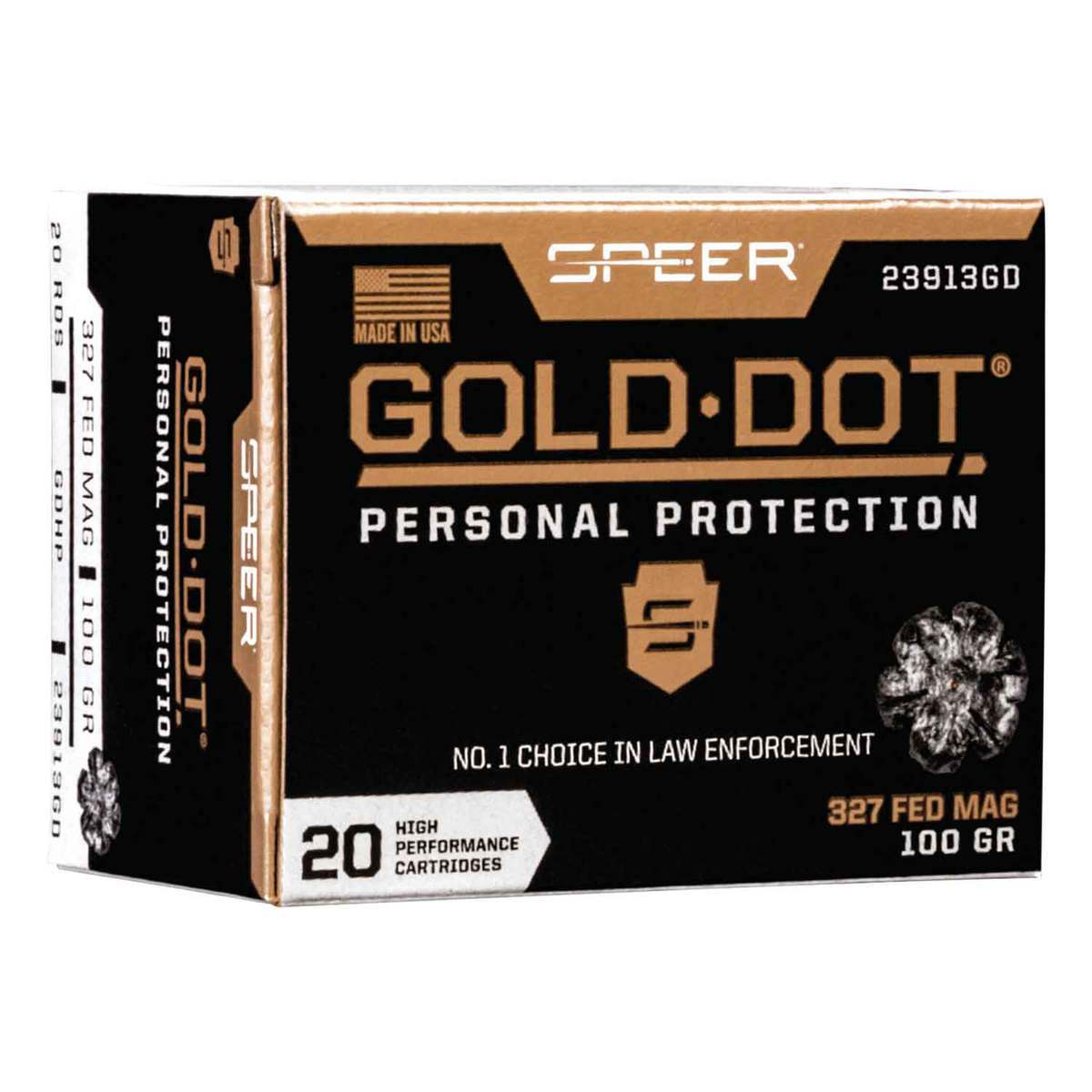 Speer Gold Dot 327 Federal Magnum 100gr HP Handgun Ammo – 20 Rounds – Gold Dot has earned the respect of police officers world-wide. No other ammunition combines such a consistent level of high performance. These loads deliver in all situations, which is why you can trust them for home and personal defense. Gold Dot hollow-point bullets are very accurate, tough and unbelievably consistent.